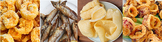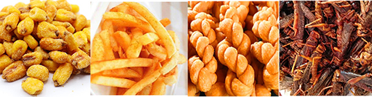 目前我司生產的油炸機廣泛應用于各種食品生產領域,例如,膨化食品(妙脆角,谷物片,奇多,空心薯笛,薯片,等),油炸面食類產品(江米條,麻花,雪棗酥,等),海鮮(魷魚,黃花魚,蝦仁,魚排,等),肉類(雞翅,雞排,雞腿,豬皮,等),堅果(花生,腰果,榛子,松子,葵花籽,等),谷物(玉米,豌豆,蠶豆,青豆,等),以及可食用昆蟲(如螞蚱、蟋蟀,等)等各種適合油炸的美味食品。