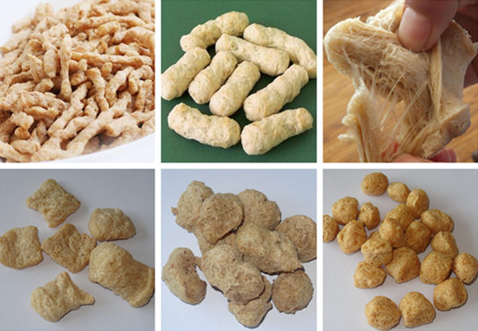 組織蛋白生產機器采用低溫脫脂豆粕、濃縮蛋白、分離蛋白、谷朊粉等為原料,可生產顆粒、柱、塊、片, 糠等形狀的蛋白產品, 用于素食、低脂、高蛋白的食品。組織蛋白可以代替肉添加到肉制品中,不僅能提高肉制品的蛋白質含量,又能吸收多余的脂肪,使其不油不膩而更顯肉感。大豆組織蛋白可制成各種風味的方便食品,絲狀、片狀蛋白產品直接用于制做素食仿肉食品。